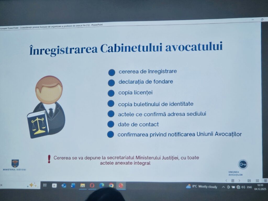 În cadrul sesiunii au fost prezentate cele mai importante proceduri legate de organizarea și exercitarea activității profesionale. Avocaților le-au fost explicate aspecte esențiale privind depunerea cererilor, înregistrarea formelor de organizare și respectarea obligațiilor legale aplicabile.